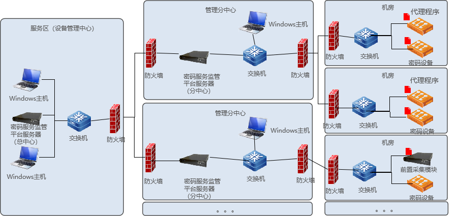 密码服务监管平台部署于指定的设备管理中心单位,可以是国家级、省级或市级,用于监测下属多个中心或机房中的密码设备。